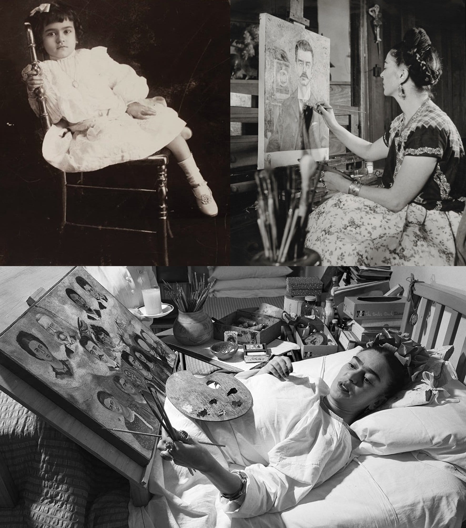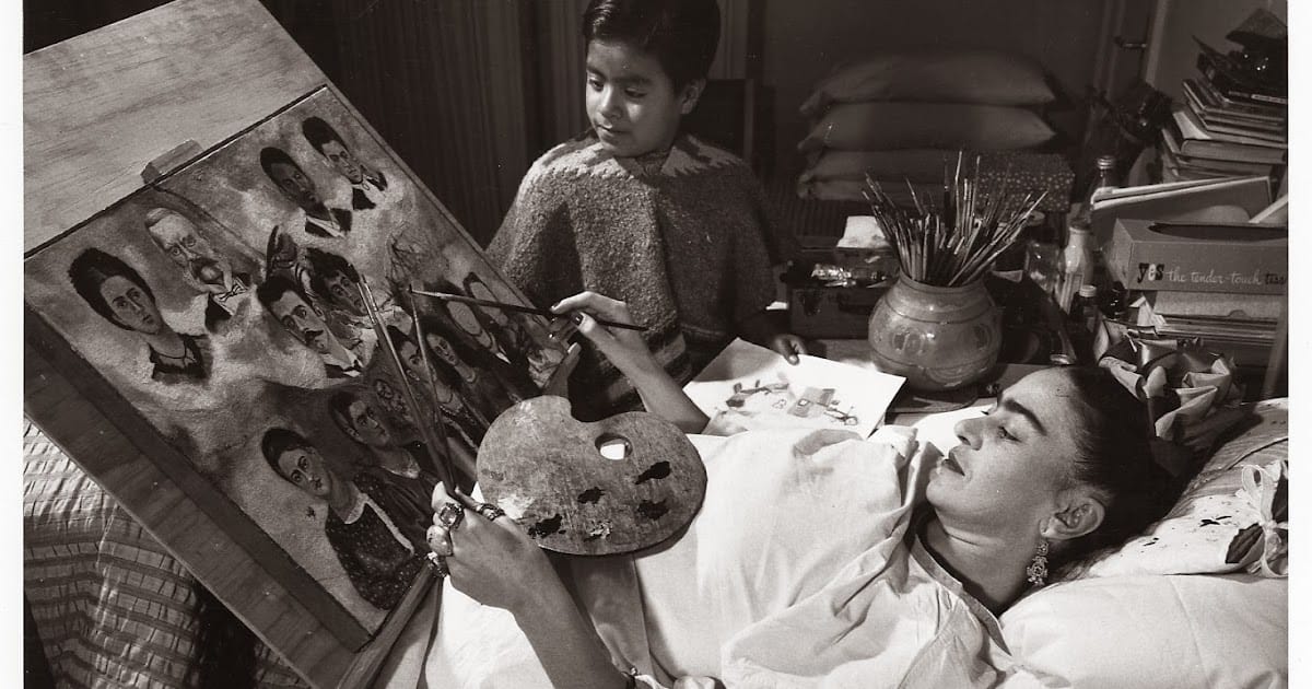Durante a recuperação, presa na cama por cerca de três meses, nasceu uma das artistas mais importantes do século XX. Sua mãe fez um suporte especial para ela pintar deitada. Seu pai, que era fotógrafo e pintava por hobby, deu pincéis e tintas. Ficar presa na cama fez com que ela começasse a pintar autorretratos: uma forma de mostrar que estava ali, olhar para si mesma e transformar sua dor em arte.