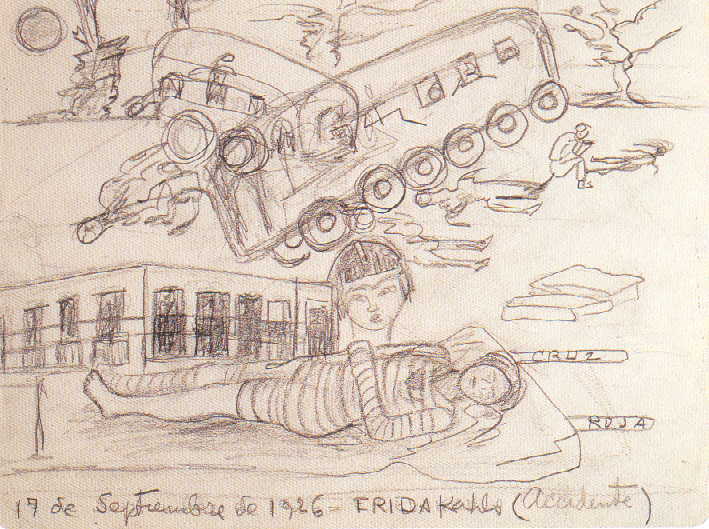 Em 1925, Frida Kahlo estava em um ônibus com seu namorado Alejandro Gómez Arias quando sofreu um acidente que mudou sua vida para sempre. O motorista tentou passar na frente de um bonde. Outro veículo não viu e bateu de frente. O ônibus foi arrastado e bateu de novo em um prédio. Algumas pessoas morreram na hora, outras morreram depois. Por milagre, Frida e Alejandro sobreviveram.