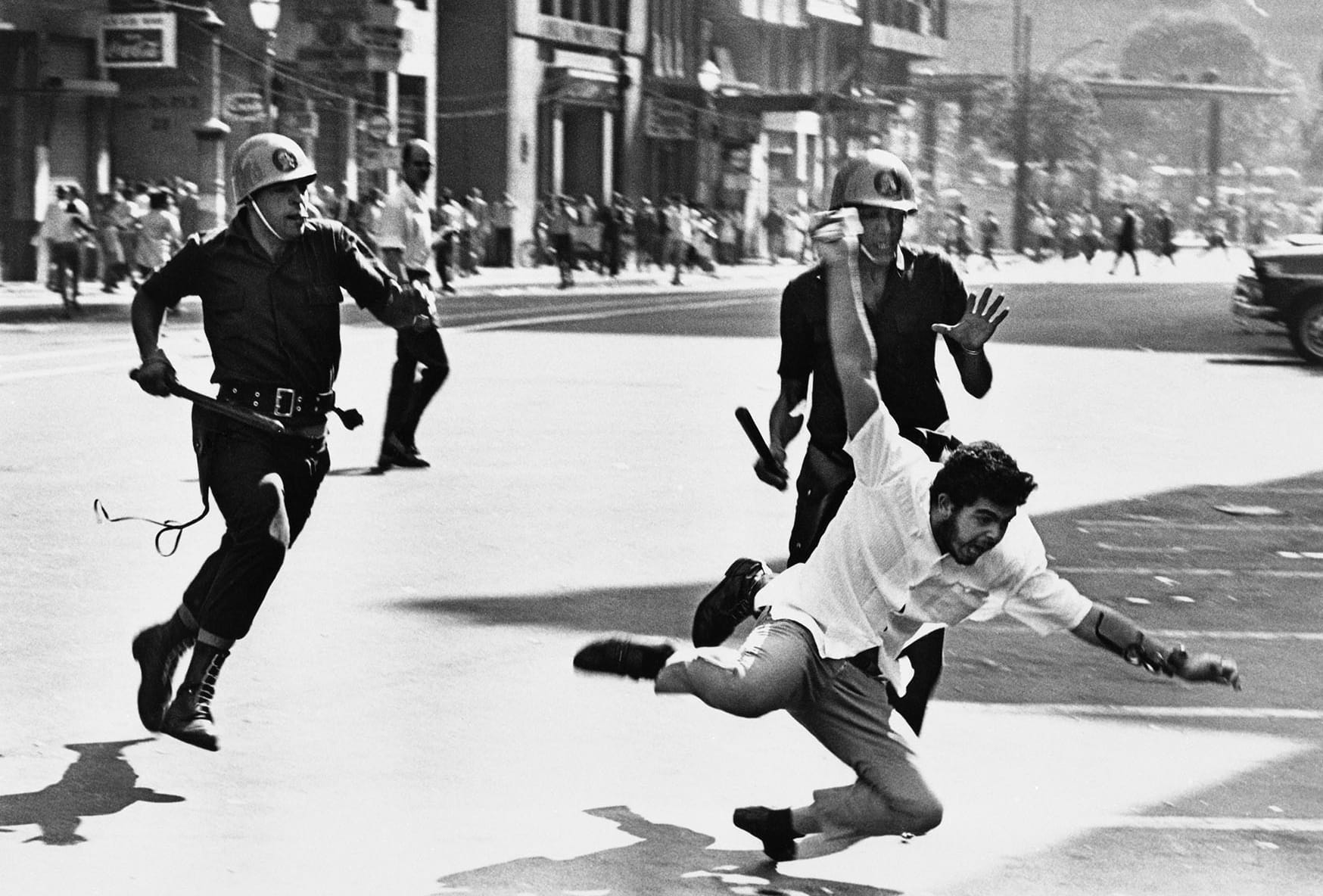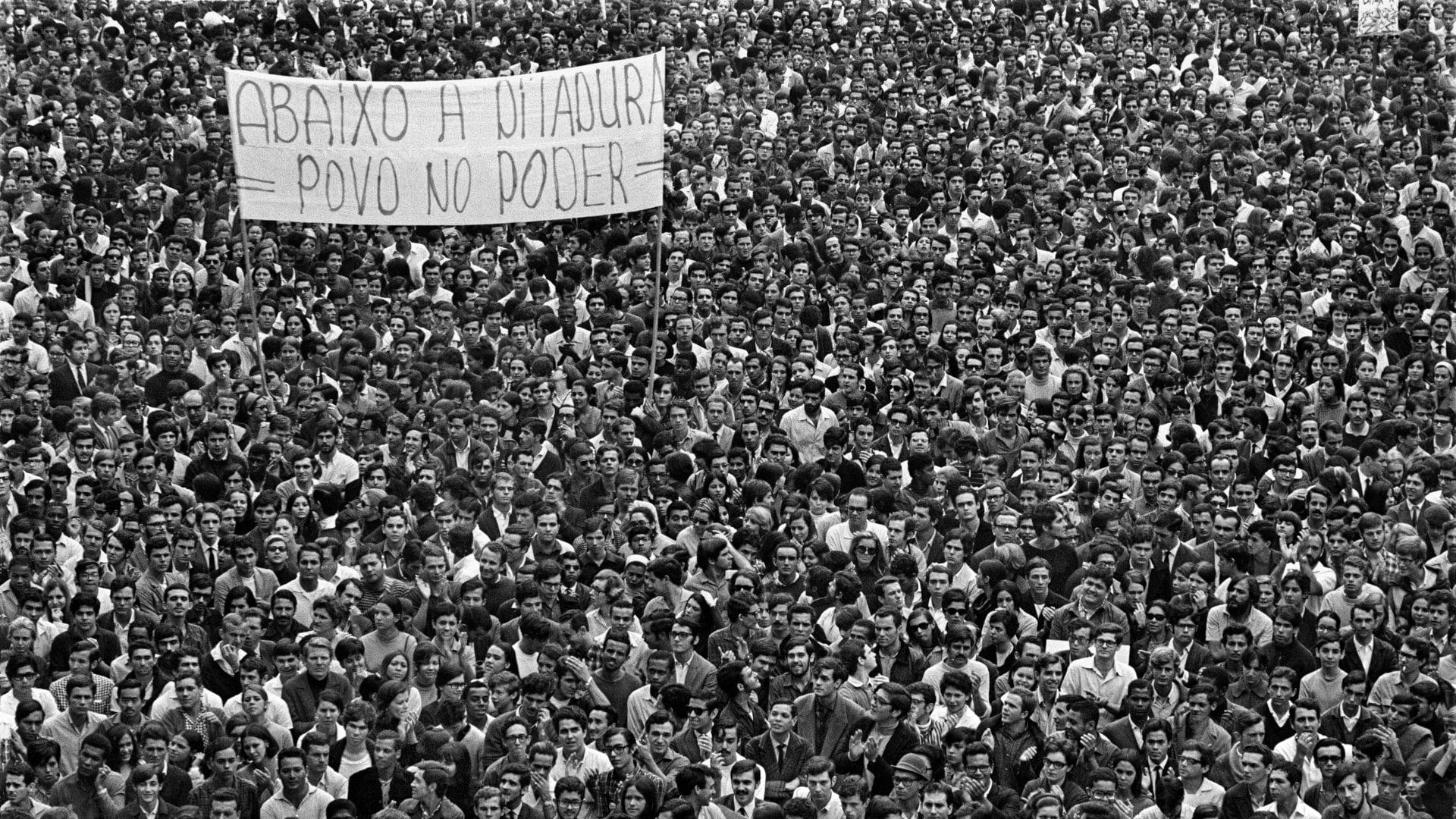 À esquerda, a emblemática imagem do jovem sofrendo a repressão de policiais; à direita, a imagem icônica da Passeata dos Cem Mil, registradas por Evandro Teixeira durante a ditadura militar (1968).